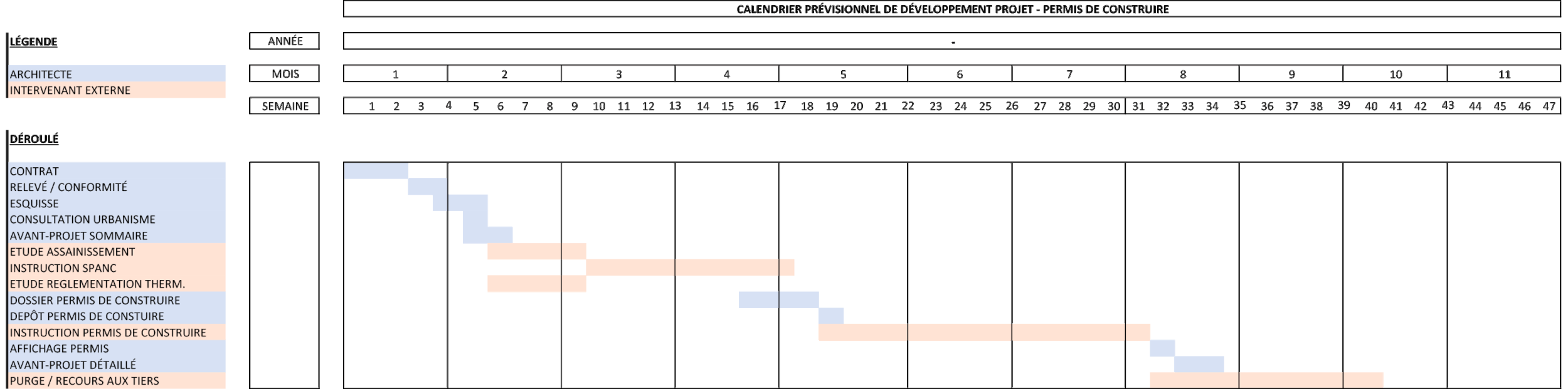 VOUS POURREZ TROUVER CI-DESSOUS UN EXEMPLE TYPE DE calendrier indiquant les délais DE DÉVELOPPEMENTs par intervenants POUR UN PROJET D’EXTENSION nécessitant, comme pour la plupart, une étude thermique et une étude d’assainissement.