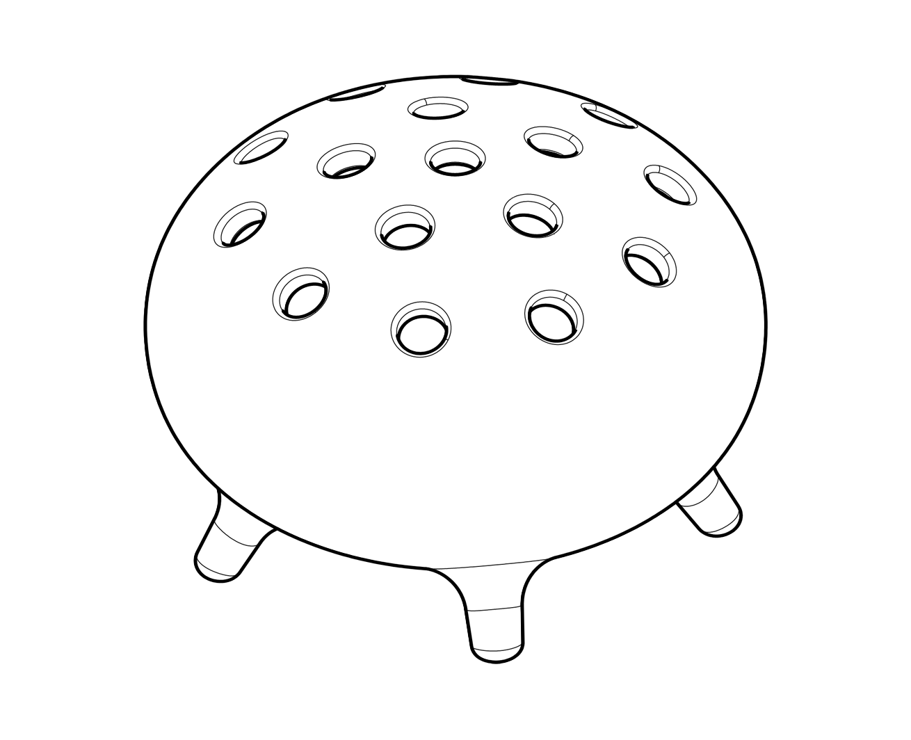 Dessins d'un diffuseur d'huile électrique en ligne, avec plusieurs trous sur la surface, supporté par trois pieds.